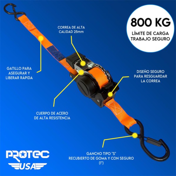CINTA AMARRE ZUNCHO CRIQUE Y GANCHO RETRACTIL AUTOMATICO PROTEC USA 800KG